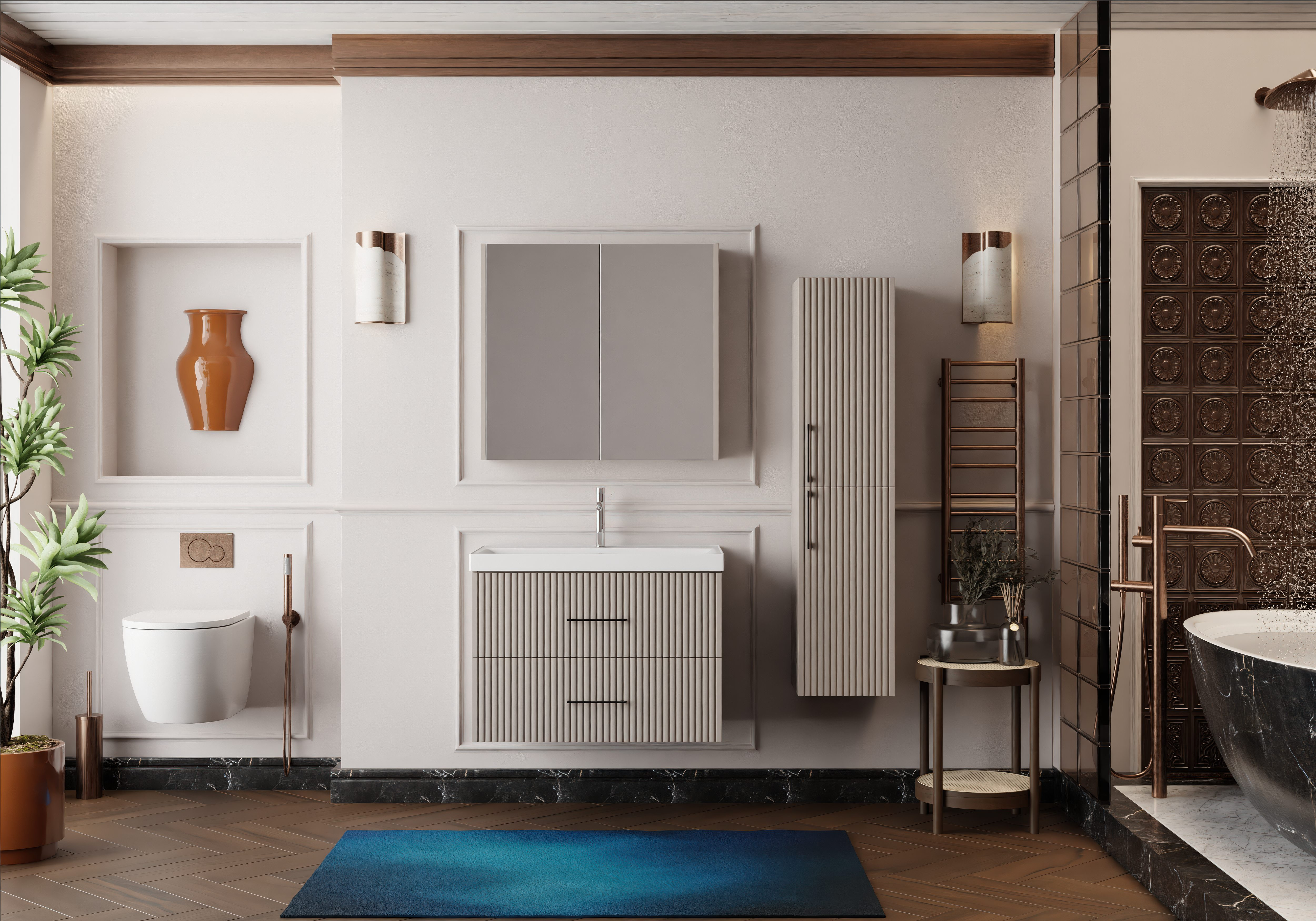 Avec cet ensemble de meubles de salle de bains de 80 cm, le regard est immédiatement attiré par la délicate texture côtelée des façades, qui confère à chaque ensemble un style unique. La teinte pastel des meubles dégage une impression de sérénité et d'élégance, accentuée par les poignées métalliques raffinées.