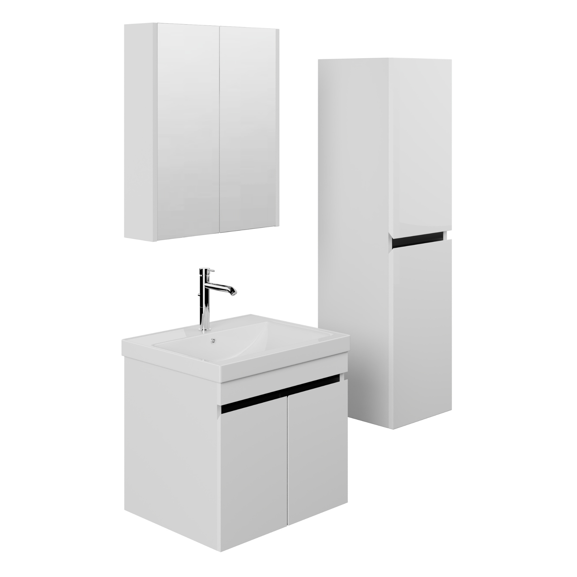 Cet ensemble de meubles de salle de bain blancs comprend des portes élégantes au design raffiné, dotées d'un système de fermeture amortie. Le panneau noir du meuble-lavabo apporte une touche de style, idéale pour une salle de bain d'invités ou une petite salle de bain. Les produits de toilette essentiels se rangent facilement à l'intérieur du meuble-lavabo.