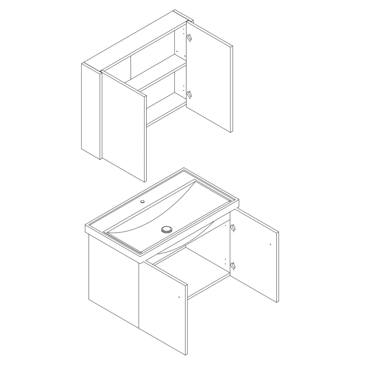 Cet ensemble de salle de bains de 80 cm, doté de deux portes, se compose de trois éléments : un meuble vasque suspendu, un lavabo encastré et une armoire de toilette avec miroir. Le meuble vasque suspendu est équipé d'un lavabo aux dimensions idéales pour un lavage des mains confortable. L'armoire de toilette, avec ses deux portes miroir, permet de prendre soin de son visage au quotidien.