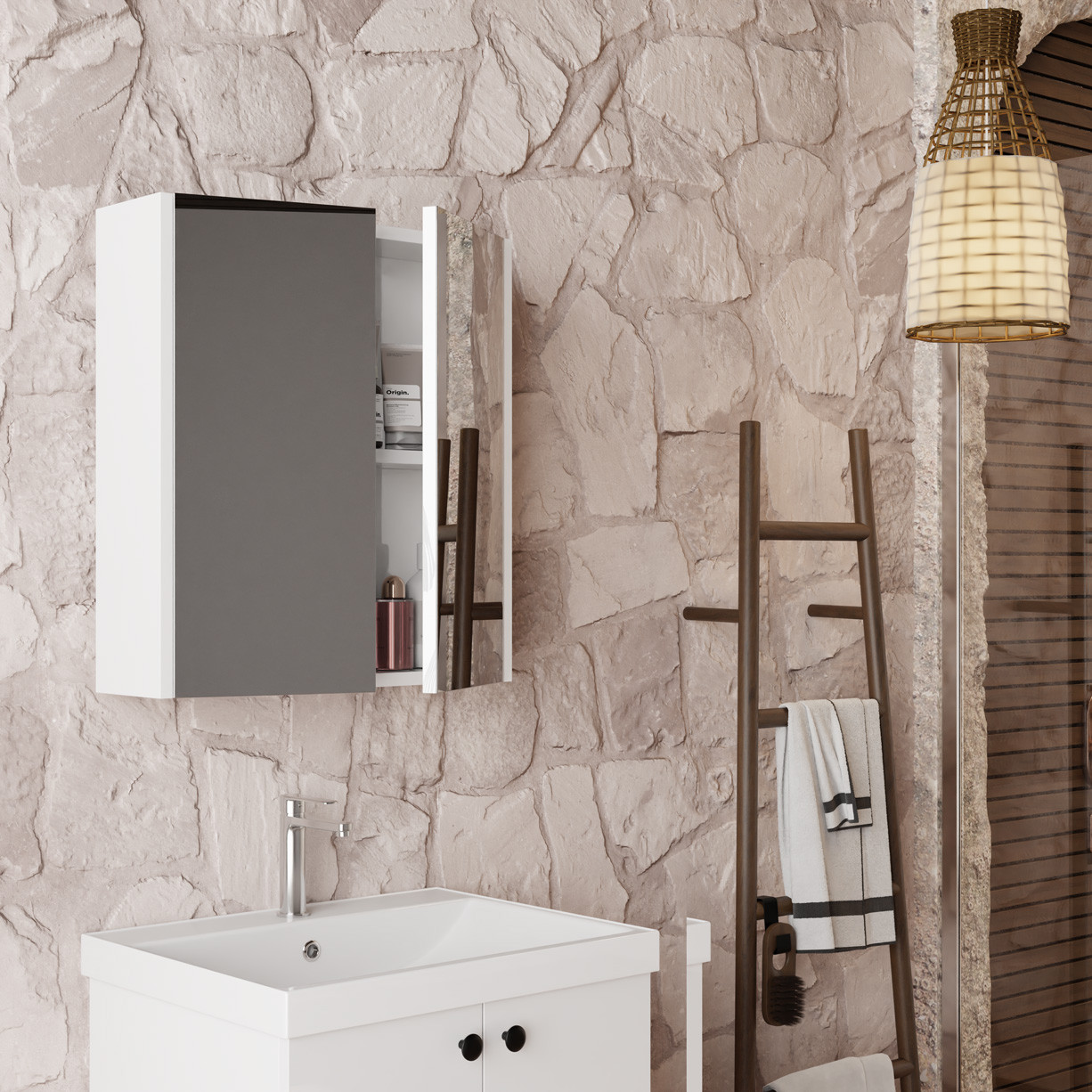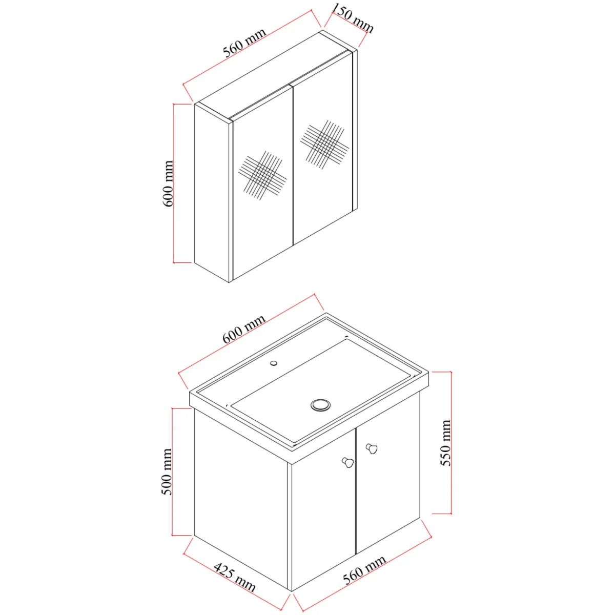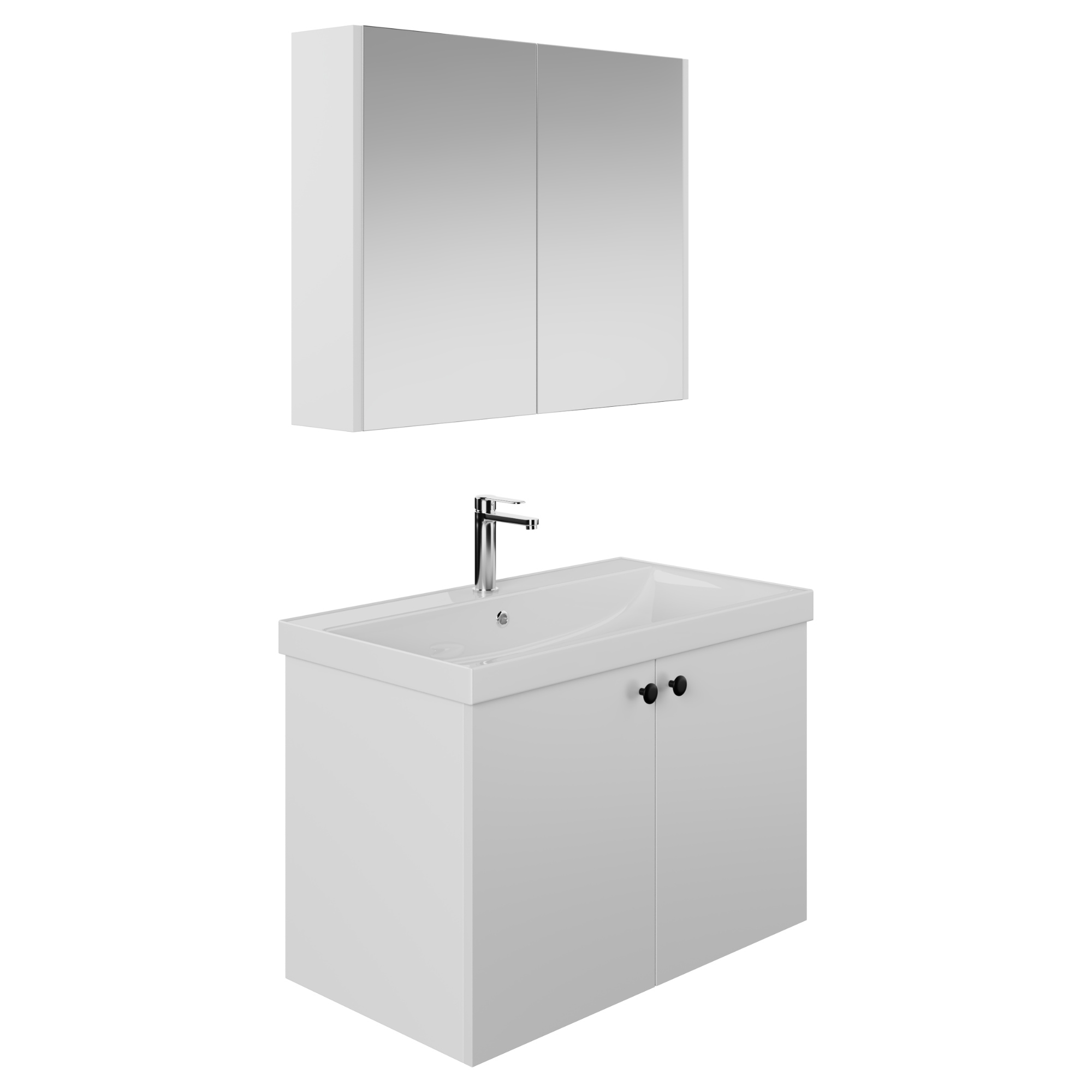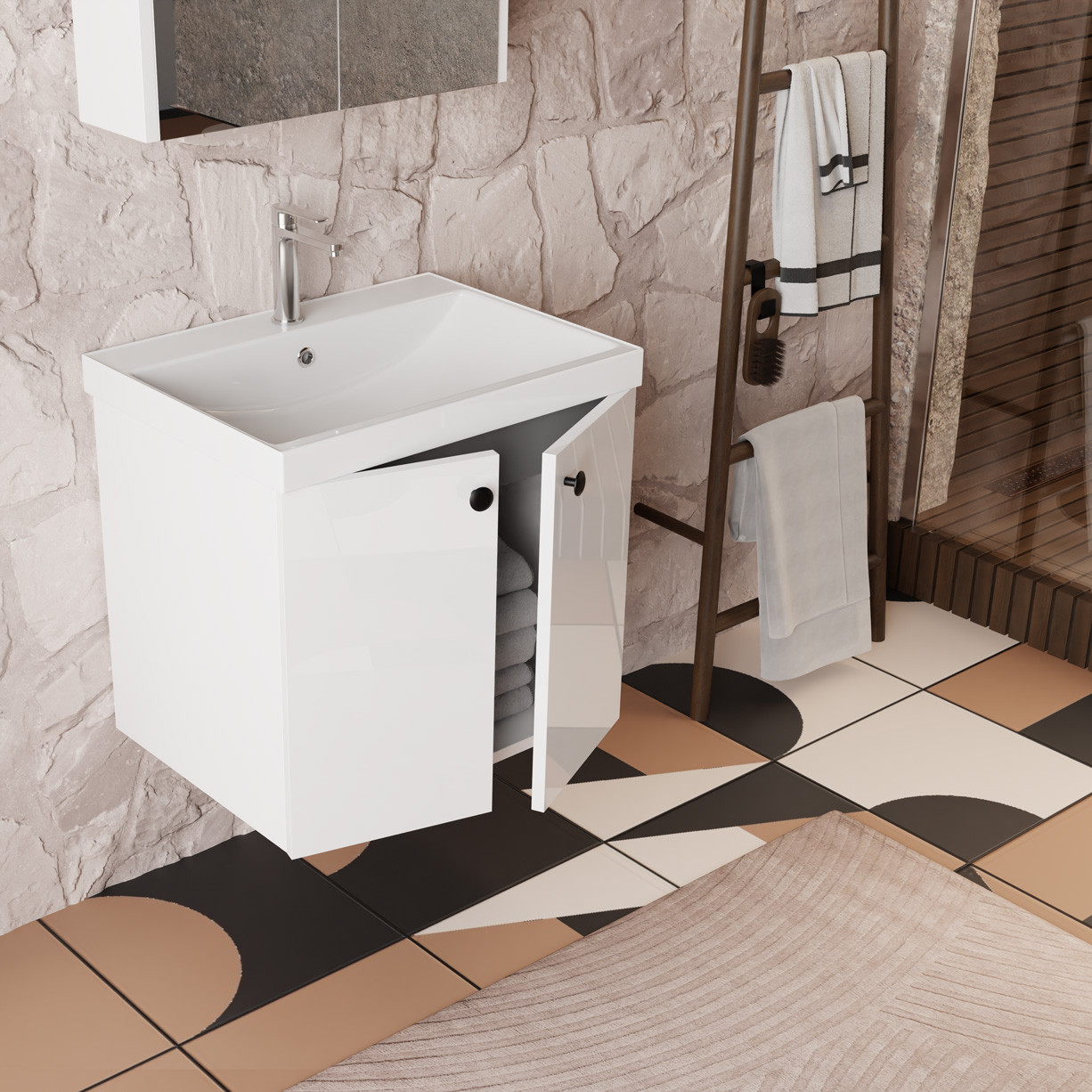 Cet ensemble de meubles de salle de bain de 60 cm, avec deux portes, se compose de trois éléments : un meuble vasque suspendu, un lavabo encastré compact et une armoire de toilette avec miroir, optimisant ainsi l’espace. Les meubles de salle de bain pour petites salles de bain se caractérisent par leur design étroit, sans pour autant sacrifier le rangement ni la surface de lavage. Ils s’intègrent plus facilement dans les niches et les salles de bain étroites.