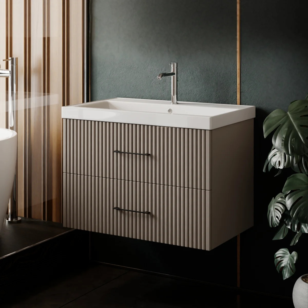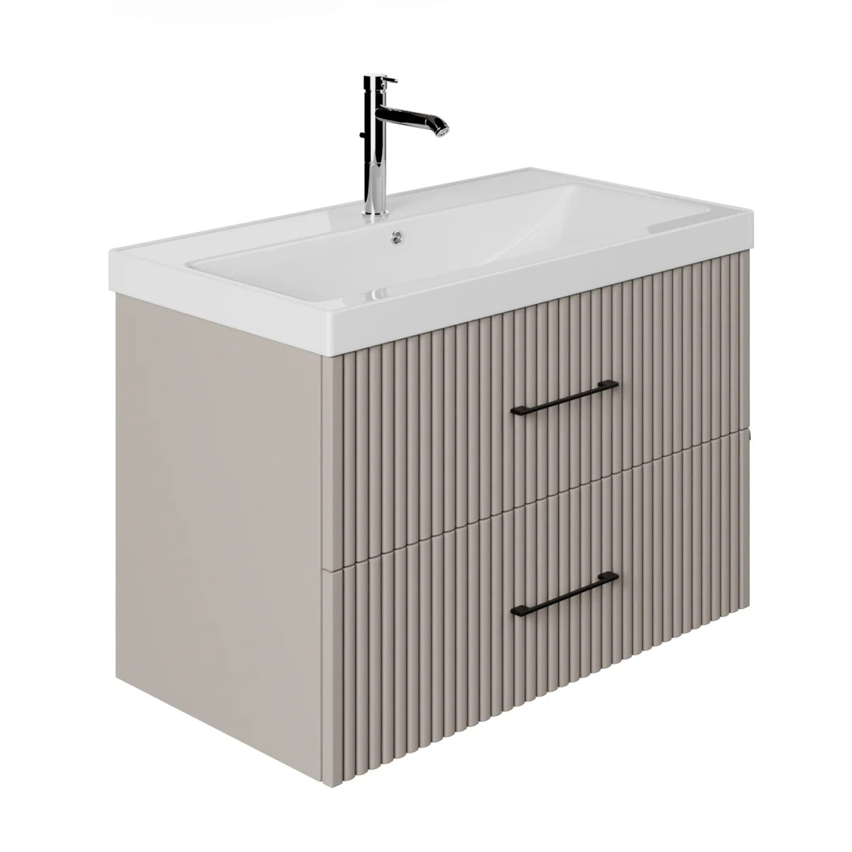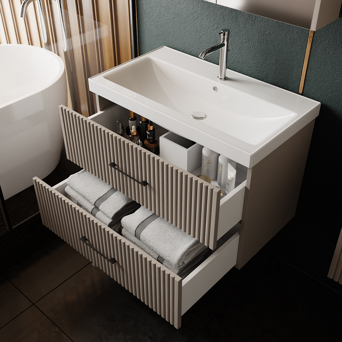 Avec ses façades rainurées, ce meuble vasque suspendu au design intemporel apporte une touche d’élégance moderne. Sa surface antireflet résiste aux rayures, tandis que les tiroirs équipés de poignées noires se ferment en douceur grâce à un système d’amortissement silencieux.
